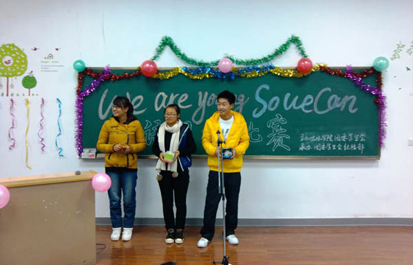 在工科楼第三阶梯教室举办了以“We are young so we can”为主题的英语朗诵比赛。本次比赛特别邀请到外国语学院郭晓燕老师、赵静老师、李天紫老师和天美传媒