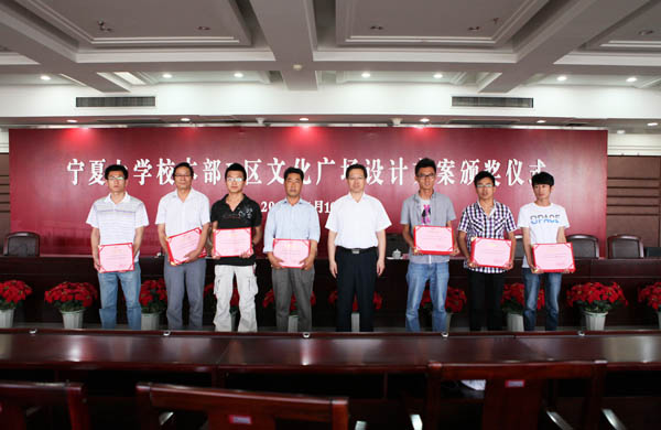 师生在行政楼六楼会议室参加B区文化广场设计方案颁奖仪式。何建国校长、赵利宁副书记、学校相关部门负责人以及其他学院教师和学生代表出席和参加颁奖仪式。副校长张成主持仪式。