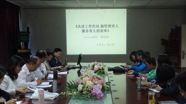 在工科楼四楼多媒体会议室开展了“两学一做”学习教育。参会人员包括学院教工第三党支部全体党员、教工一、二党支部委员以及各学生党支部委员。会中,学院党委书记马正亮结合“两学一做”第二专题学习内容为全体参会人员做了题为《改进工作作风,做管理育人服务育人的表率》的专题讲座。马正亮书记以天美传媒