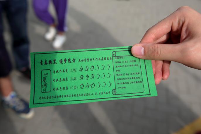 董教授认真仔细地对专业作品区(A类)、专业基础区(B类)和专业色彩区(C类)的每一幅作品进行了评审,并不时向学生询问作品的设计思路等内容。参观结束后,董教授在选票上选出了自己心目中的优秀作品,与前来参观的同学进行了亲切交谈,与大家分享参观的感受,并对学院在审核评估期间组织活动的形式和同学们设计作品的质量给予了充分肯定。