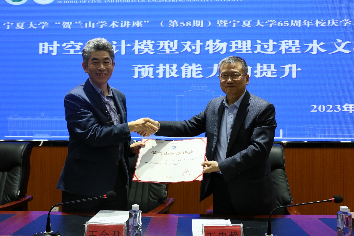 第58期“贺兰山学术讲座”首场报告,也拉开了本次学术校庆的序幕。报告会由学院党委副书记尹娟主持,会前王忠静副校长向王全君教授颁发了“贺兰山学术讲座”证书与纪念册。