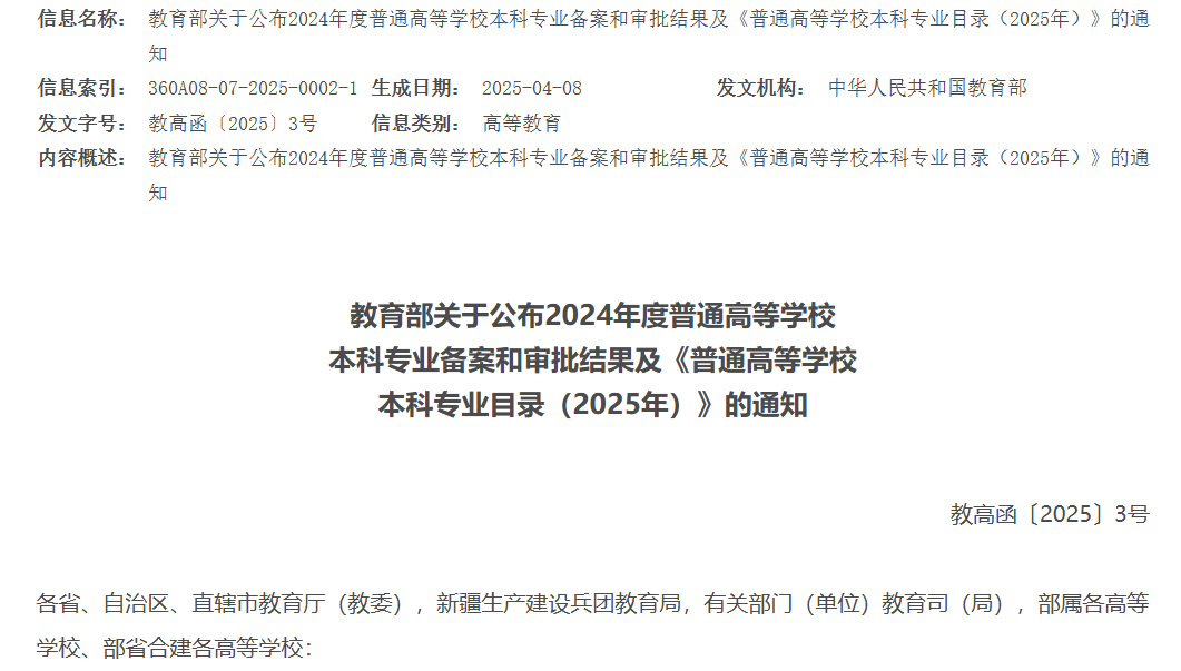 近日,教育部公布2024年度普通高等学校本科专业备案和审批结果,天美传媒