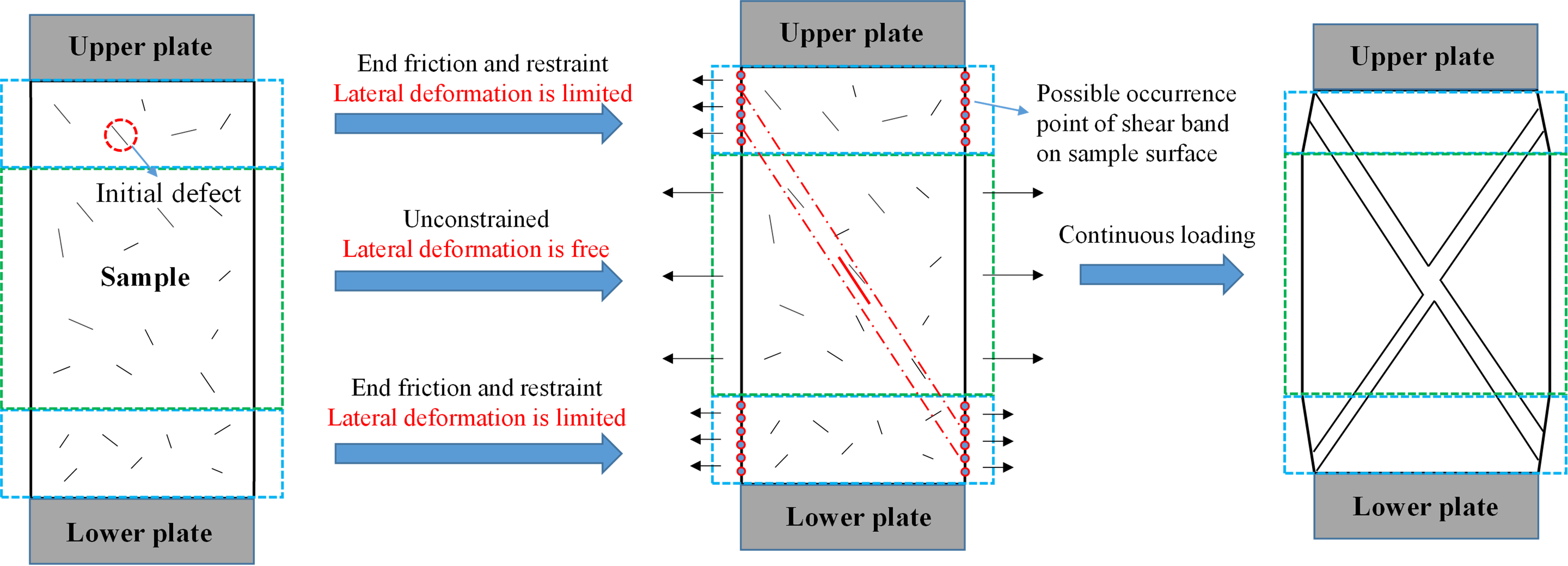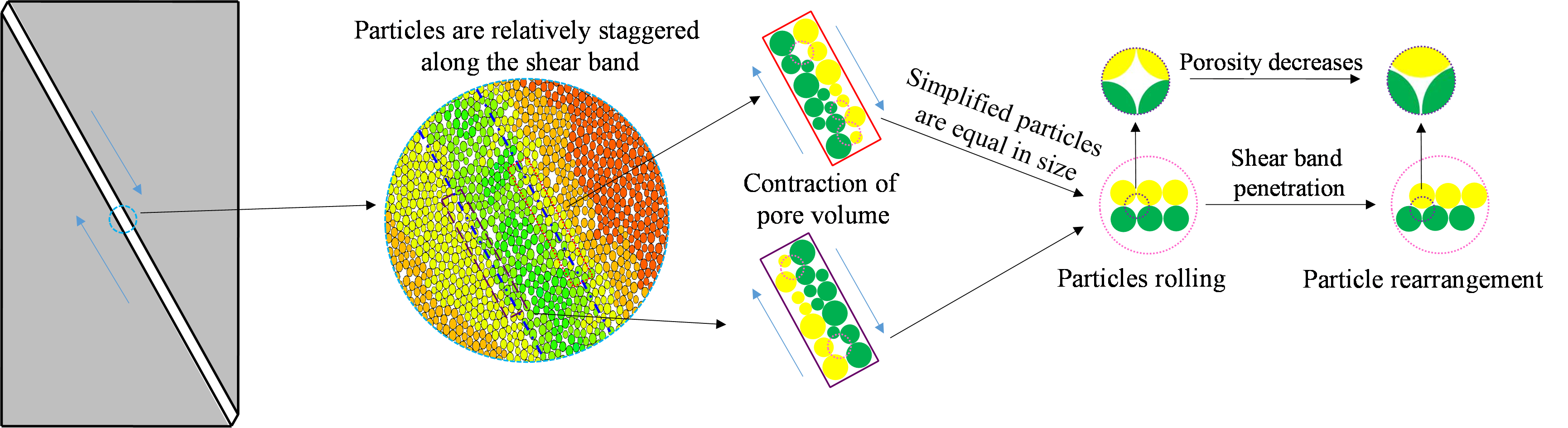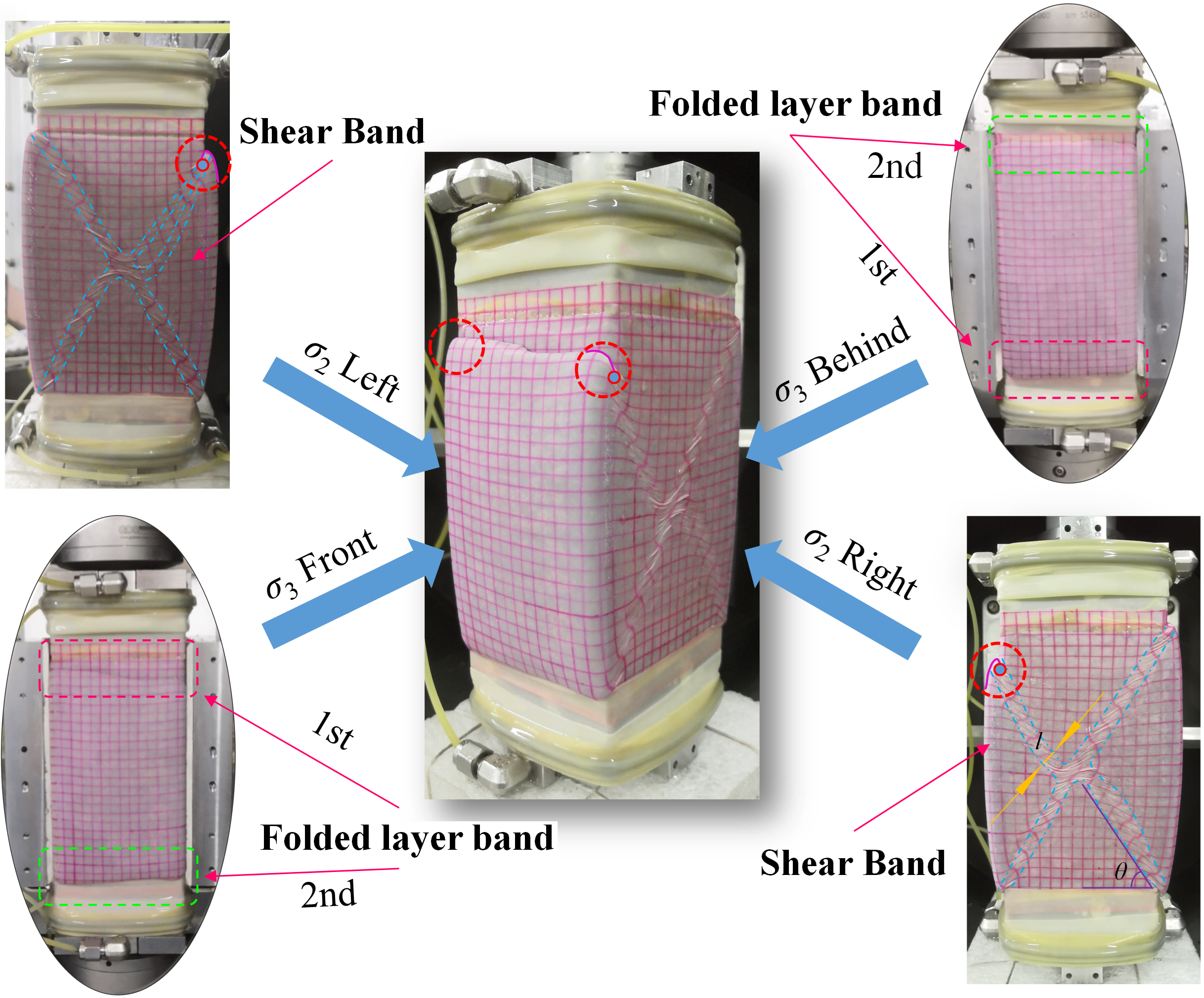 在此项工作中,研究团队考虑了多种影响因素下应变局部化对砂土真三维变形和强度特性的影响。1)定量表征了局部化变形导致的剪胀性、破坏与临界状态线相较于均匀变形存在的明显差异。2)对不同排水条件下,剪切带的形成时刻及应力-应变关系对剪切带发展的响应进行了讨论,归纳了应变局部化影响下软化的类型。3)对试验测得的剪切带宽度和倾角进行统计,分析了控制因素对其影响,并给出了理论计算剪切带倾角的建议性方法。4)依据试验现象总结了剪切带的形成机理。研究成果突破了多数传统双轴试验无法监测中主应力或监测仅为局部土体的限制,将应变局部化描述由二维扩展至三维应力空间。