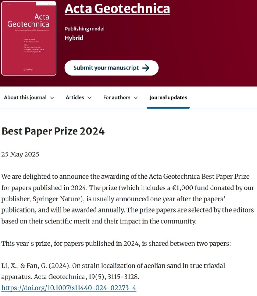 李学丰教授团队发表在国际岩土工程旗舰期刊Acta Geotechnica的研究成果“On strain localization of aeolian sand in true triaxial apparatus”,获得该期刊2024年度最佳论文奖(Best paper prize),并获由Springer斯普林格官方提供的1000欧元现金奖励。Acta Geotechnica是岩土工程领域最顶级SCI源期刊之一,为中国科学院一区Top期刊,其年度最佳论文奖自2012年设立,每年仅由编委会选取1~2篇论文获此殊荣。李学丰教授为该论文的通讯作者和第一作者,博士生樊国伟为共同第一作者,该工作得到了国家自然科学基金项目(No.12162028)和宁夏科技创新领军人才计划(No.KJT2019001)的资助。