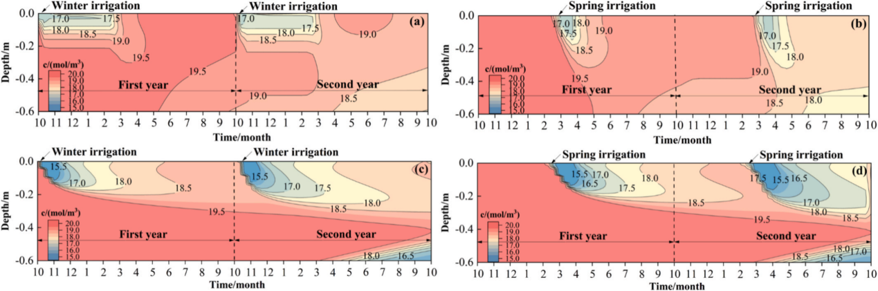 图1.冬灌/春灌盐分浓度等值线图(ab-有冻融循环;cd-无冻融循环)