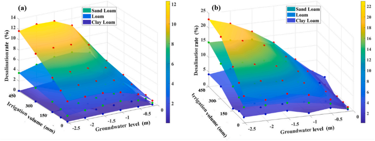 图3. 不同土质、灌溉量、地下水位条件下的灌后脱盐率