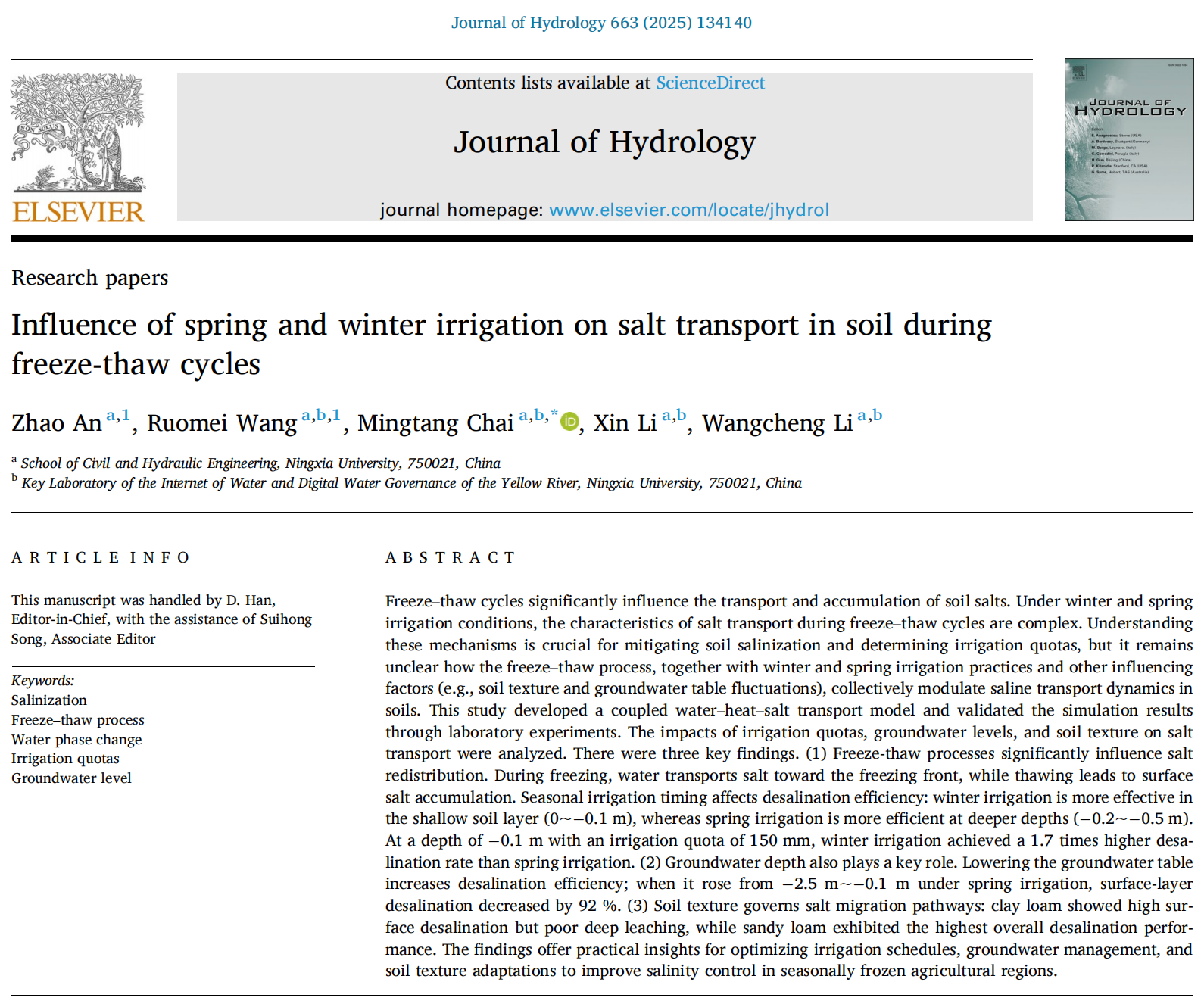/励行书院2022级农业水利工程专业本科生安钊,在柴明堂副教授和李王成教授的指导下,以第一作者在水利工程领域国际著名期刊《Journal of Hydrology》(中国科学院一区Top,影响因子6.3)发表题为“Influence of spring and winter irrigation on salt transport in soil during freeze-thaw cycles”的研究论文。