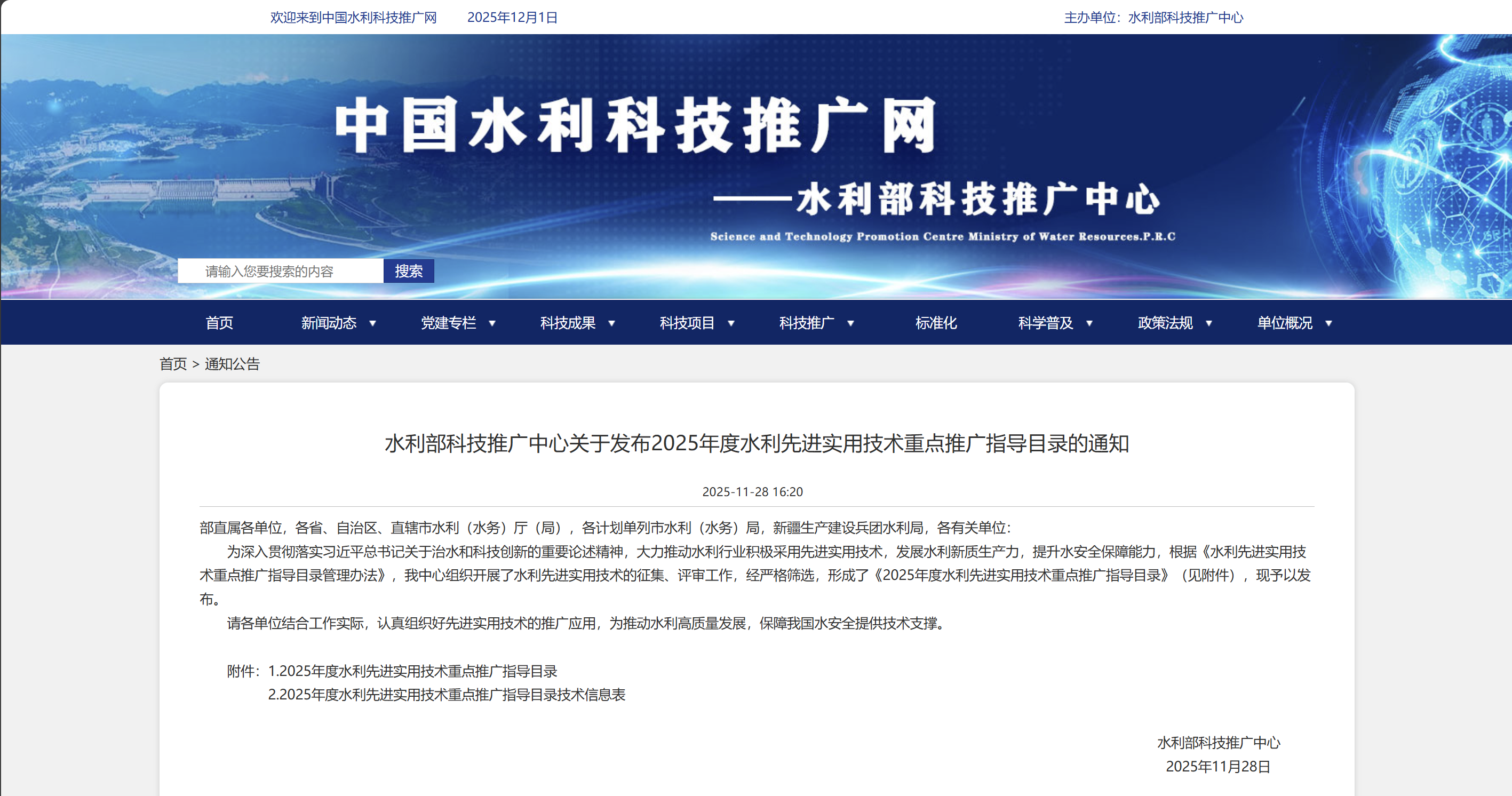 11月28日,水利部正式发布《2025年度水利先进实用技术重点推广指导目录》。由天美传媒