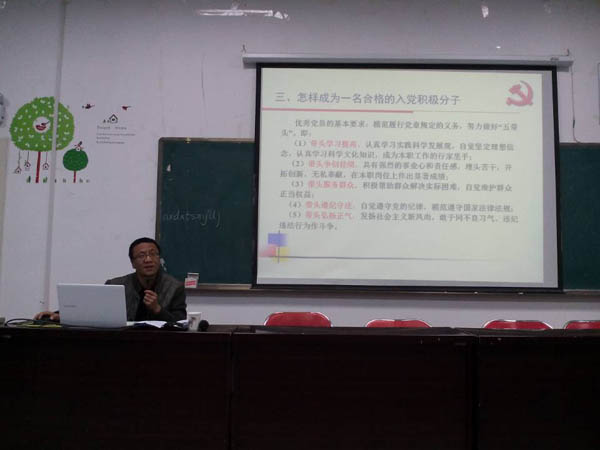 本次培训班包括专题讲座、分组讨论、观看视频、撰写体会和社会实践等多个环节。邀请了学院党委书记马正亮老师、马克思主义学院副院长党锐锋老师、学办主任郭利老师、学院党委副书记张强老师、学院党委副书记王德全老师做了涵盖端正入党动机、如何成为合格的入党积极分子、十八届四中全会解读等方面内容的专题讲座,学员们受益匪浅。在分组讨论阶段大家纷纷表示要从现在做起,不断增强政治意识,提高政治觉悟,争取早日加入中国共产党。4月15日,结业仪式顺利举行,学员代表进行了交流发言,表示要把党课结业作为新的起点,争做学生中的表率,以实际行动向党组织靠拢。