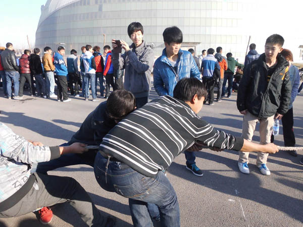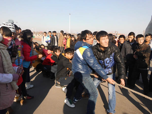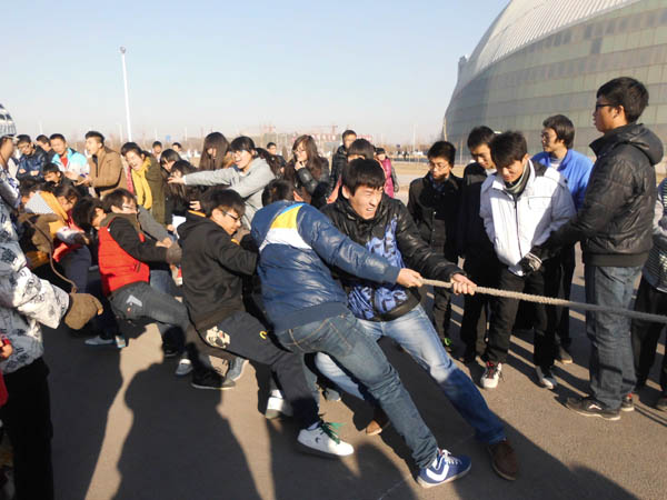 为促进班级间交流、提高团体凝聚力,2013年12月11日下午天美传媒 举办迎新生拔河比赛。比赛过程中,气氛异常紧张。各班的啦啦队热情火爆,为参赛同学增添了不少信心。加油声、呐喊声,充斥在校园上空,久久的回荡。即使是寒冬时节,依然没有抹杀学生们的热情,比赛气氛被一次又一次的推向高潮。农水班获得此次比赛的冠军,城规班与建筑班分别荣获亚军、季军。