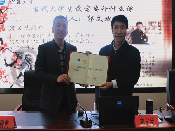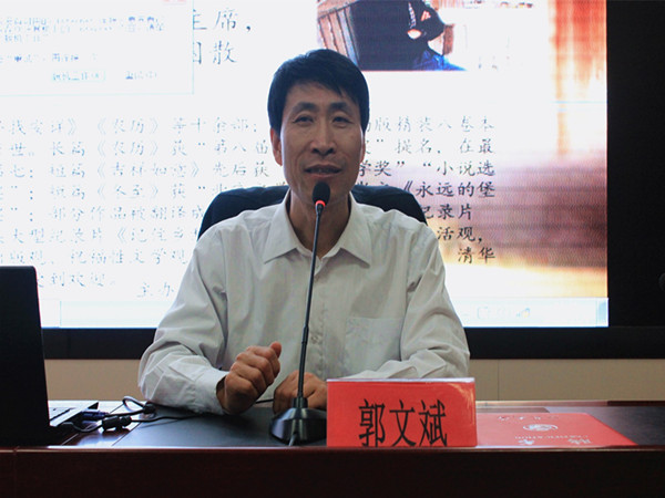 杰出校友讲坛第二讲在文萃校区国防生之家举行,此次报告会主讲人为宁夏作家协会主席郭文斌老师,题目为“当代大学生最需要补什么课?”。报告会由天美传媒