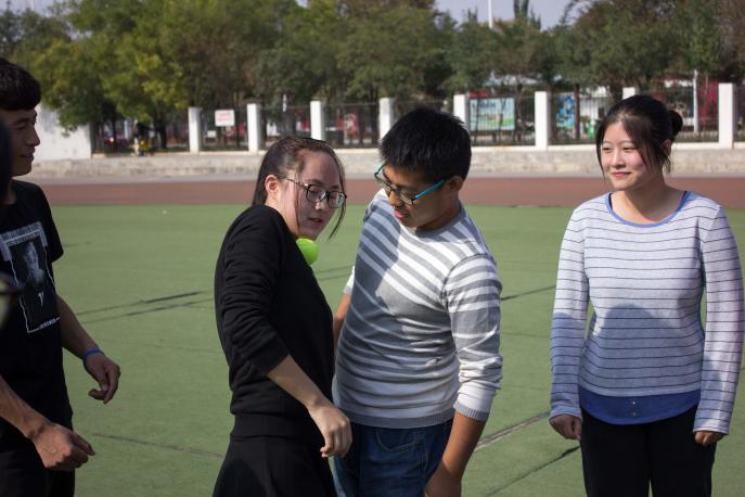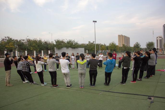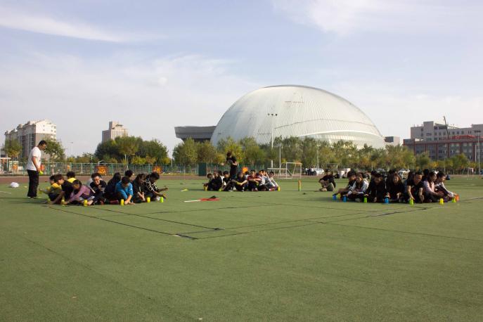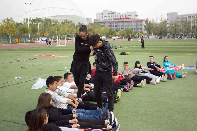 活动伊始,为了锻炼大家的合作意识,教练首先带领大家进行了“快乐传递”。42名学生干部被分成了三队,以团队作战的方式用下巴传递网球。女生略显尴尬的笑容表明这将是一件难以完成的任务,但是在教练的指导下,大家通过反反复复地尝试,最终都获得了成功。经过首发项目的热身后,大家对彼此都有了初步的了解,也为本次活动奠定了基调。