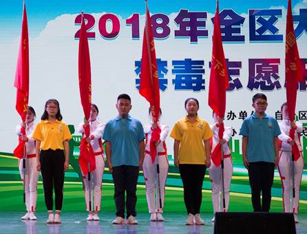 启动仪式上,宁夏回族自治区党委常委、政法委书记张韵声,宁夏回族自治区人大常委会副主任左军,宁夏回族自治区公安厅厅长兼督察长、党委书记许尔锋,宁夏回族自治区十一届政协副主席马秀珍为全区各个高校禁毒志愿服务队授旗。授旗仪式结束后,主办方带领全体禁毒志愿者宣誓:“无毒青春,健康生活;参与禁毒、人人有责;时刻牢记历史教训,以振兴中华为己任,以尽忠人民为职责;敢于斗争,勤于行动,善于关爱,乐于奉献;在身边立足,从点滴做起,坚持不懈地为禁毒工作努力,为中华民族的伟大复兴共享青春力量!”