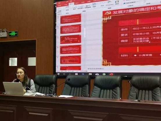王娜老师结合“不忘初心、牢记使命”主题教育学习,从个人工作实际出发,针对目前学院党员发展中存在的问题,从申请入党、入党积极分子的确定和培养考察教育、发展对象的确定和考察、预备党员的接收以及预备党员的教育考察和转正五个方面作了详细解读。强调了党员发展和考察的严肃性和规范性,支委要履行好自己的责任,带领支部党员严格落实“三会一课”制度,做到支部党员档案的及时归档与审查;同时,入党联系人和介绍人必须认真履职尽责,全面了解所联系积极分子和党员的政治思想情况,日常表现情况等,把好党员发展的入口关。