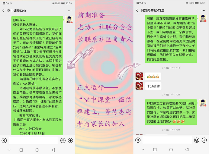 考虑到社区孩子们和在校大学生志愿者各自的时间安排问题,我们没有采用各个学校“空中课堂”的视频教学形式,而是选择了相对自由的“多对多”辅导形式——建立包括全部志愿者和有需求的社区家长在内的微信群,家长们互相交流、随时发问,志愿者看到提问即时解答。