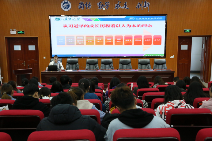 开班仪式结束后,按照培训计划,学院党委副书记苏宇静为全体学员进行了“习近平以人为本的理念”授课辅导。苏书记分别从习近平总书记的成长历程看以人为本的理念和《习近平谈治国理政》为大家进行了讲解。通过讲述习近平总书记的七年知青岁月等各个时期的理念践行,向大家介绍了正是因为总书记一直把民族、人民、党放在前面,在各方面提出正确的引导,才有了国家现在的发展繁荣和安定。