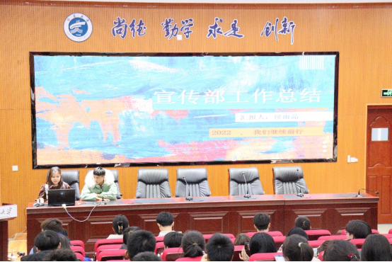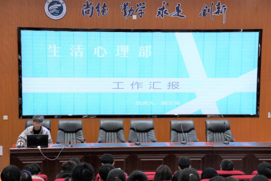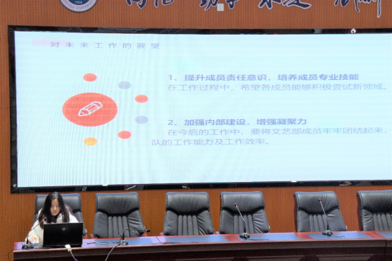 学生组织各部门分别进行工作述职。汇报顺序按照团委、学生会、易班学生工作站交叉进行,具体为办公室、文艺部、运营部、组织部、体育部、学风建设部、宣传部、生活心理部、信息部、外联部、志愿者工作部(社团管理部)。各部门总体上按照部门工作进行情况、工作出现的问题、部门建设、以及未来展望等几方面进行工作报告,让各位同学知悉了各部门工作详情,互相交流经验。
