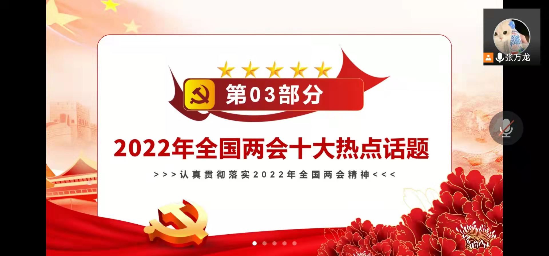 2022�3�19日晚,交管本科党支部线上召开2022年全国两会专题学习。参加此次会议的有党员以及预备党员共30人。本次会议由张万龙同志主持召开,围绕中国人民政治协商会议第十三届全国委员会第五次会议的内容以及会议将释放哪些中国发展的信号展开,本次的学习会从以下四个部分进行介绍�