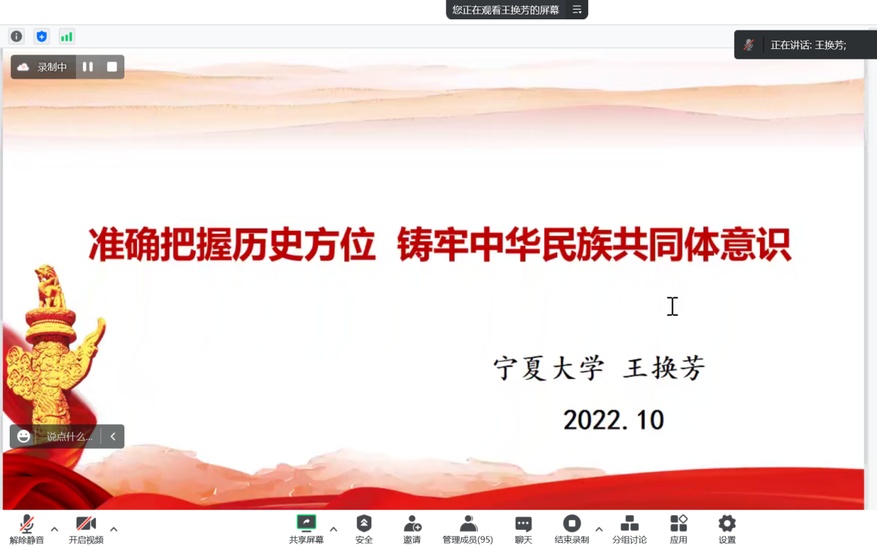 王换芳围绕“中华民族概念的历史演变”“从中华民族伟大复兴战略高度把握新时代党的民族工作的历史方位”“高度重视民族工作是贯穿中国共产党百年历史的一条红线”“坚定马克思主义五观,增强铸牢中华民族共同体意识”四个方面进行了深刻解读。