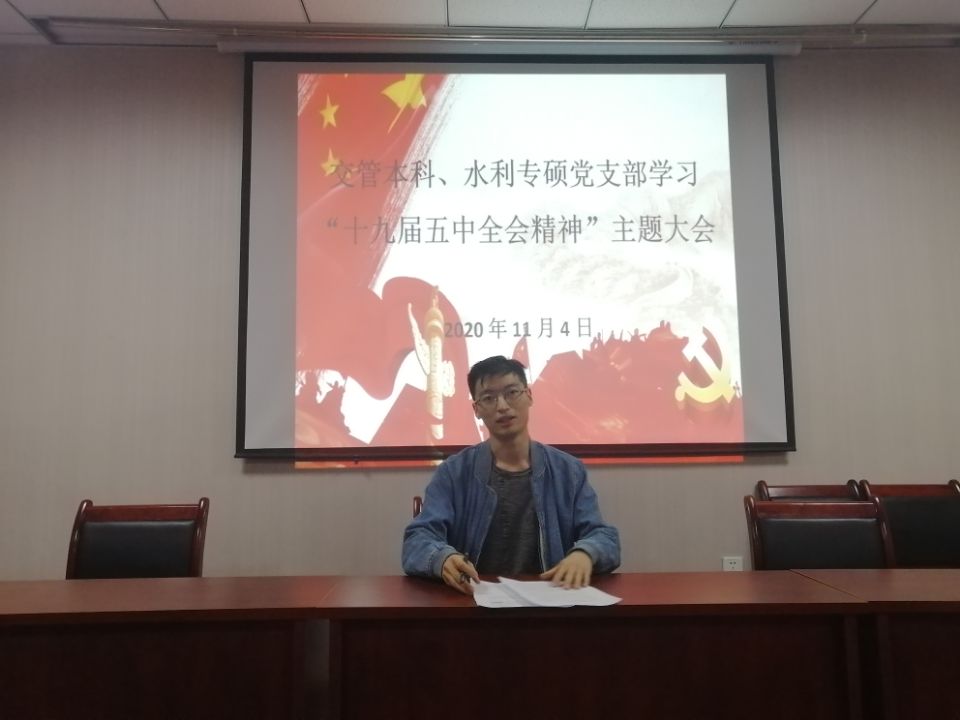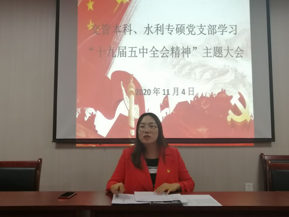 交管本科、水利专硕党支部在知行楼505室联合开展党的十九届五中全会精神主题学习大会,本次会议由支部书记王娜主持,交管本科、水利专硕党支部党员参加。